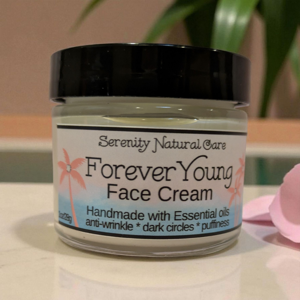 Forever Young Face Cream is made with natural anti wrinkling ingredients that are great for maturing skin. Made with natural shea butter, almond oil, coconut oil, frankincense, carrot seed, cypress, peppermint and melaleuca essential oils. These ingredients are known to smooth, soften, reduce fine lines, reduce wrinkes, reduce and remove dark circles, puffiness and even out your skin tone. Leaving you with an amazing look and radiant bare skin! Some have found they no longer need to wear foundation after using Forever Young Face Cream. Bonus... ingredients naturally contain spf for a natural sunscreen also!
